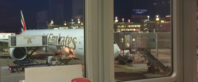 Start in Düsseldorf Um 17 Uhr komme ich entspannt am Düsseldorfer Flughafen an. Am Schalter von Emirates checken viele ein, die eine Kreuzfahrt auf der Aida gebucht haben. Die Boing 777-300 ist zu 99% besetzt.