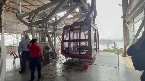 Die Seilbahn hat nur zwei Gondeln Blick von oben auf den Tempel Das ist der Betrieb auf einer normalen öffentlichen Straße
