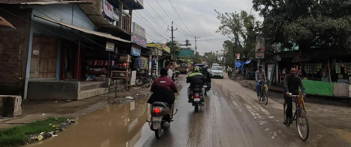 Wir fahren zur Fähre Und rauf auf die Fähre auf dem Brahmaputra Hier soll in drei Jahren die Brücke fertig sein Da vorne ist der Anleger für die Fähre Endlich geht‘s an Land in Sivasagar Wir fahren am Sivadol Tempel vorbei Straßenbauarbeiten Das gelbe Gebäude ist unser Hotel Mit dem Elektro TukTuk zum Silvadol Tempel Silvadol Tempel