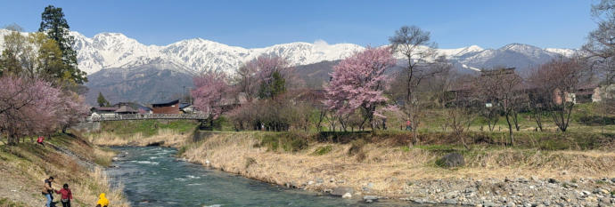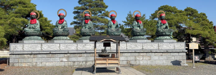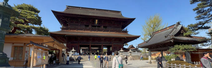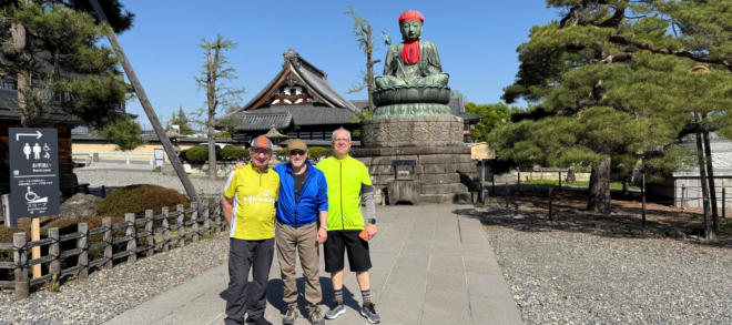 Vom gestrigen Regenwetter ist nichts übrig geblieben. Der Himmel ist fast wolkenlos. Tolle Ausblick auf die japanischen Alpen Unser Weg führt uns mitten durch einen japanischen Friedhof Der Ausblick auf die japanischen Alpen begleitet uns heute Vormittag Mittagspause Buddhistischer Tempel in Nagano Helmut, Jay und James vor Buddha Statue Wir genießen ein spezielles japanisches Menü