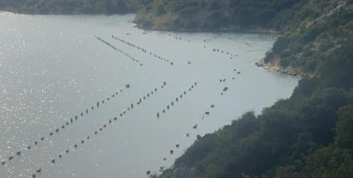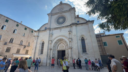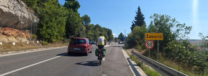 Ernst erklärt uns die heutige Strecke Wir verlassen Vodice Es geht über schmale Feldwege Eine alte Kirchenruine Hin und wieder müssen wir die Hauptstraße benutzen Brücke über die Krka Muschelzucht Auf sehr einsamen Straßen ab in die Berge Sibenek Wird hier vor dem Fahrstil der Autofahrer gewarnt? Michael hat uns ein sehr leckeres Mittags Picknick angerichtet Immer wieder tolle Ausblicke Wir tauschen unsere Fahrräder nicht gegen  die Fähre, sondern gegen das Schnellboot aus Gleich sind wir an unserem Ziel: Split
