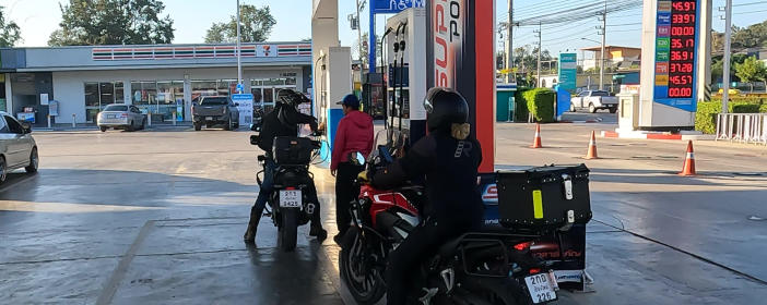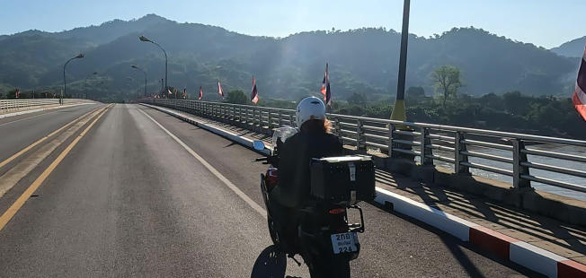Bevor wir Thailand verlassen, füllen wir den Kraftstoff auf. Wir erreichen die Grenze zu Laos Und noch eine Kontrolle Wir fahren über die Brücke des Grenzflusses Mekong Und jetzt freie Fahrt nach Laos Uns begegnen eine Menge Mopeds Geschäftiges Treiben am Rand der Straße Wir biegen in die Einfahrt zum Hotel ein Hier mussten wir ein Motorrad verladen Mein Vorderrad hat eine kleine Delle abbekommen Hier ein Beispiel für kleinere und größere Löcher