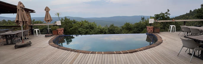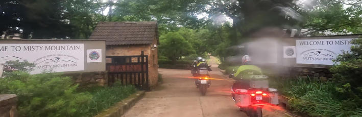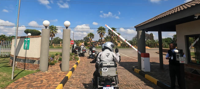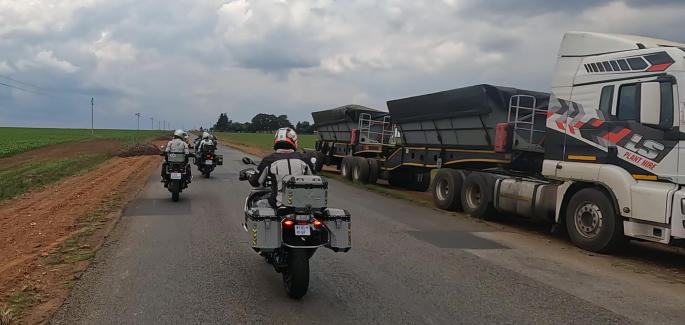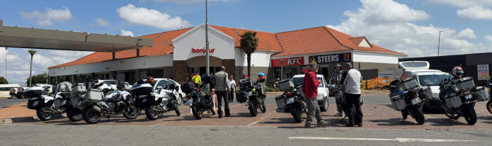 Briefing am Morgen Die erste Pause Helmuts Motorrad Und noch ne Pause im Regen Hier übernachte ich heute Blick aus dem Hotelzimmer Hotel Pool mit Fernsicht Wir verlassen Johannesburg Auf der Autobahn geht es schneller Hier sind die Straßen sehr nass Große LKWs gibt es hier sehr viele In der Nähe des Long Tom Passes Am Hotel angekommen