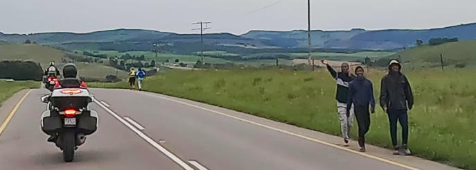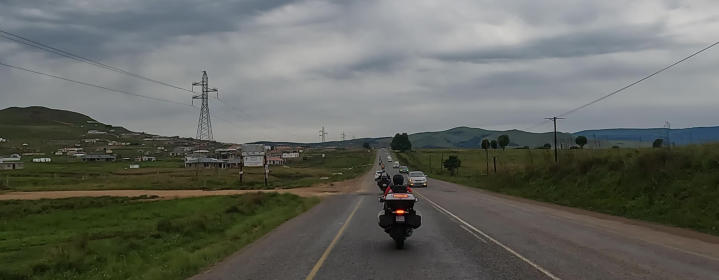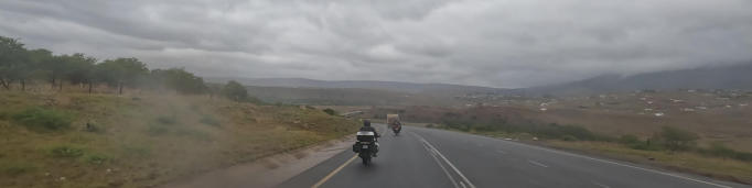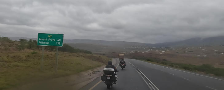 Wir starten heute eine halbe Stunde früher in Hilton. Es sind 420 km bis Mthatha. Gegen Mittag erwischt uns wieder kalter Nebel und starker Regen. Das Motorrad Thermometer zeigt 14 °C an. Deshalb gibt‘s heute nur Bilder der Fahraufnahmen.